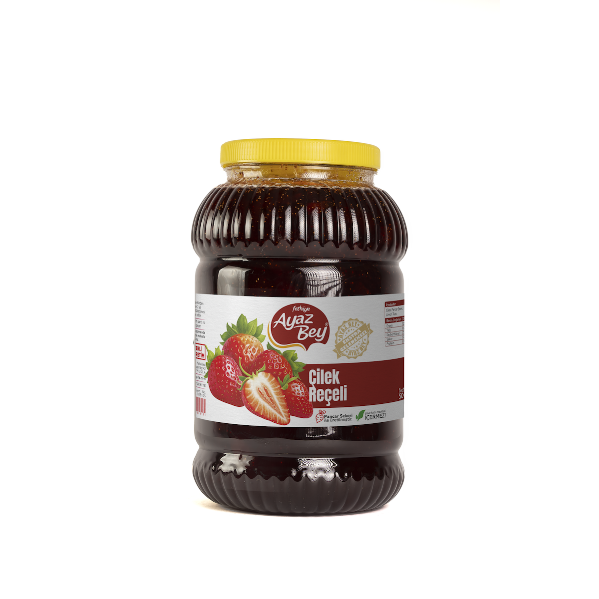 % 100 Pancar şekeri ile yapılmıştır. Glikoz – nişasta bazlı şeker (NBŞ) içermez. Koruyucu içermez. Meyve içeriği oranı en az % 55 Net: 5000 gr.